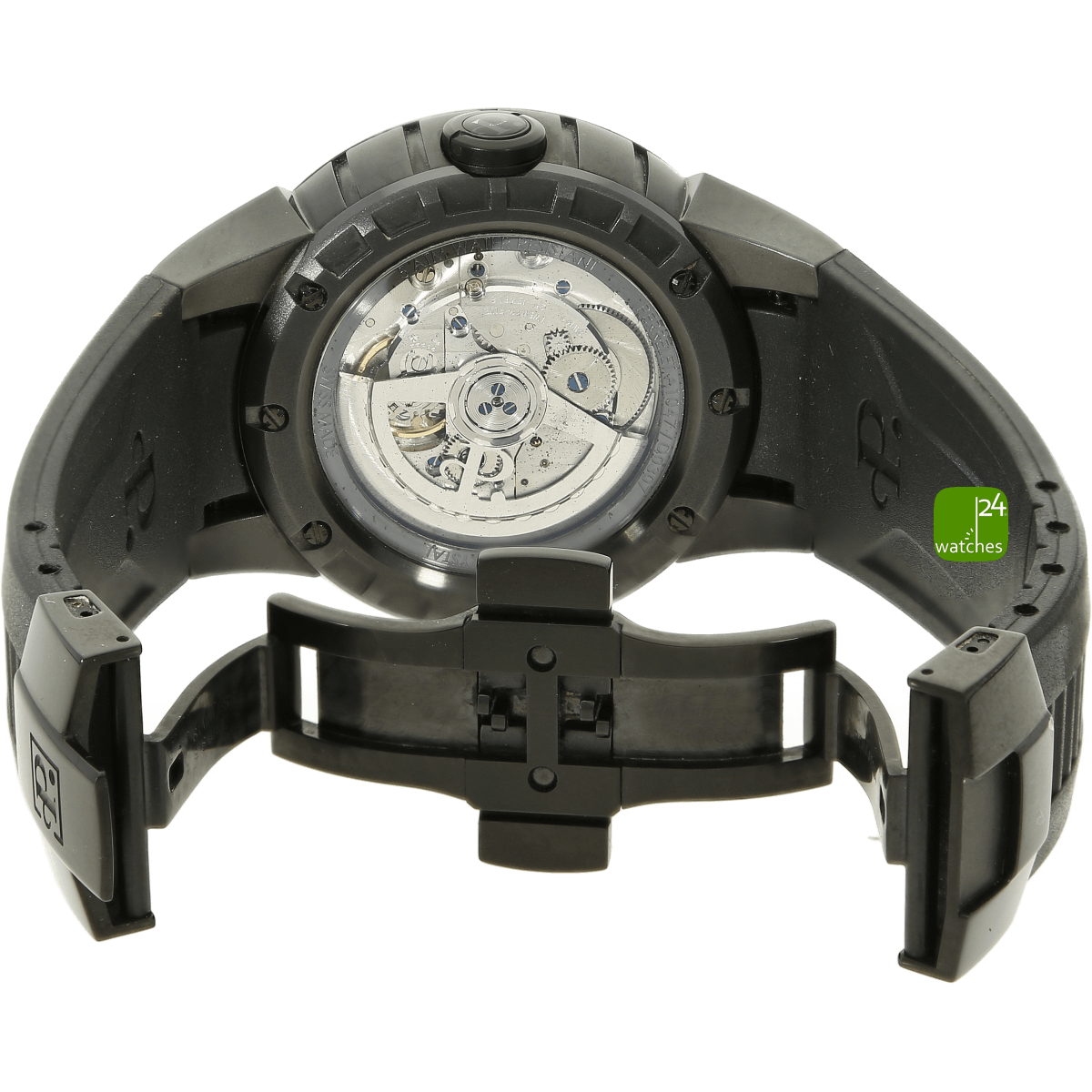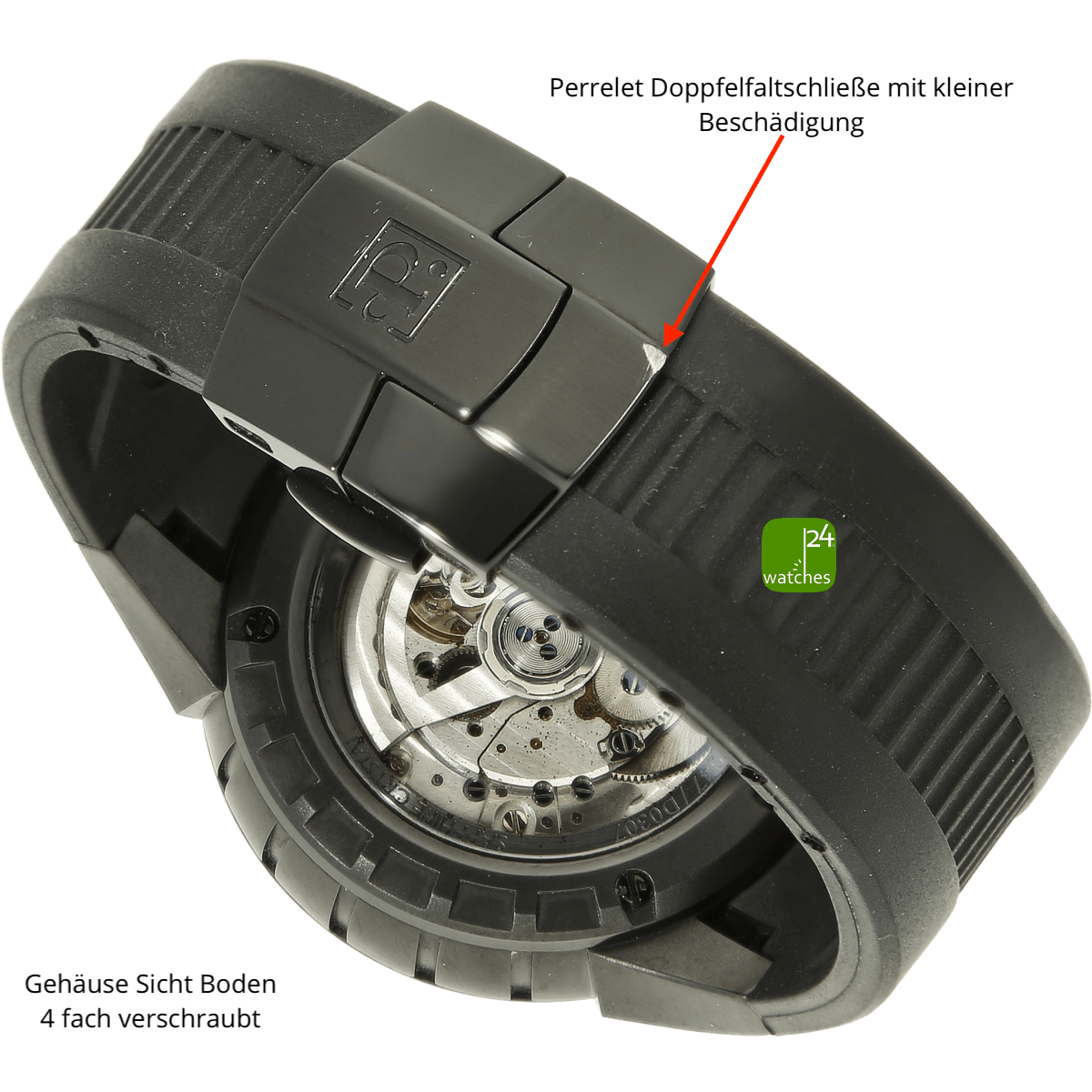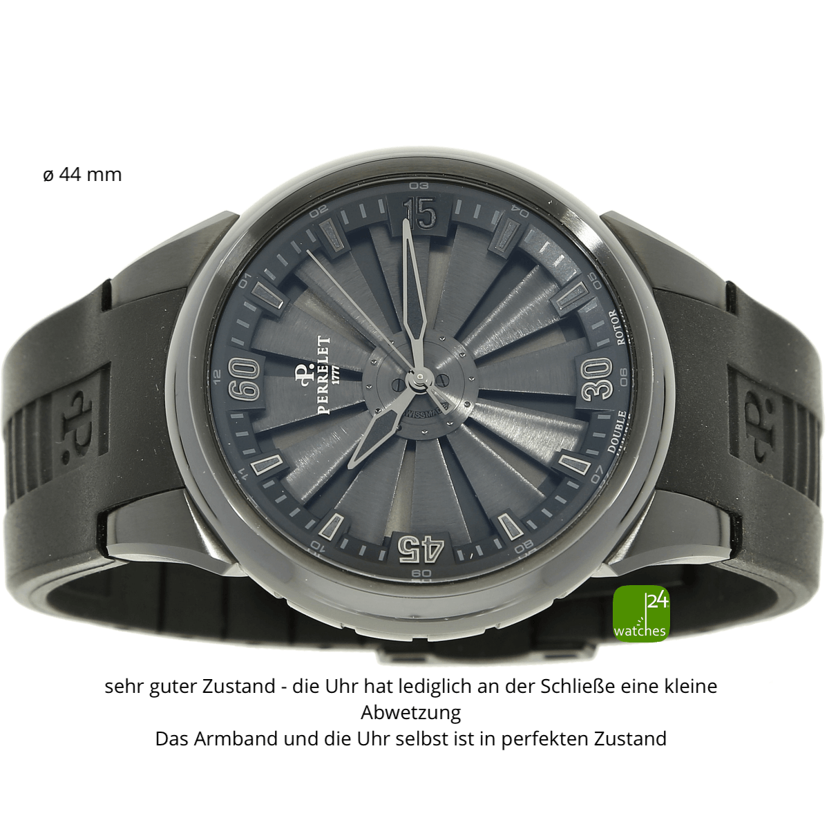Edelstahl geschwärzt | Breite ca 44 mm ohne Krone gemessen | mit Krone ebenfalls 44 mm (Krone ist in das Gehäuse eingelassen) | von Bandanstoss zu Bandanstoss 54,5 mm | Gehäusehöhe 12,5 mm | Gehäuse-Sicht-Boden 4 fach verschraubt | Saphirglas unbeschädigt | orig. Perrelet Krone mit Bügelverschluss | Lünette glänzend schwarz | Bandanstoss 18 mm | lt Hersteller 50 m wasserdicht | Gesamtgewicht 139 Gramm
