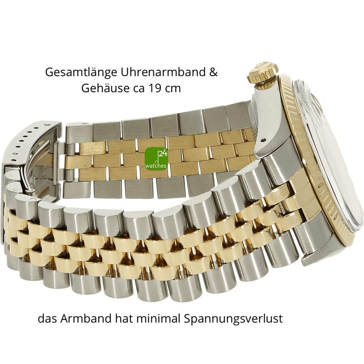 Edelstahl | 36 mm im Durchmesser ohne Krone gemessen | mit Krone 38 mm | von Bandanstoss zu Bandanstoss 44 mm | Gehäusehöhe 12,5 mm | massiver geschraubter Gehäuseboden | Kunststoffglas mit Datumslupe bei 3 Uhr in neuwertigen Zustand | orig Rolex Krone verschraubt in Gold | Gerändelte Lünette aus 18 ct / 0,750 Gelbgold | Bandanstoss 20 mm | lt Hersteller 100 m wasserdicht | aktuell 5 bar dicht Gesamtgewicht 98,05 Gramm