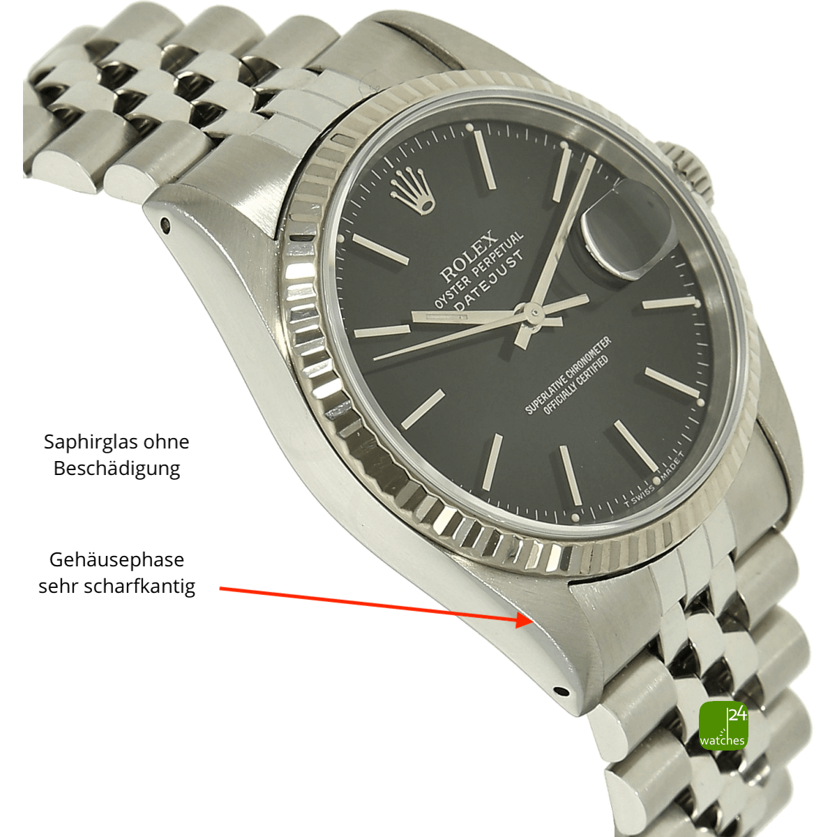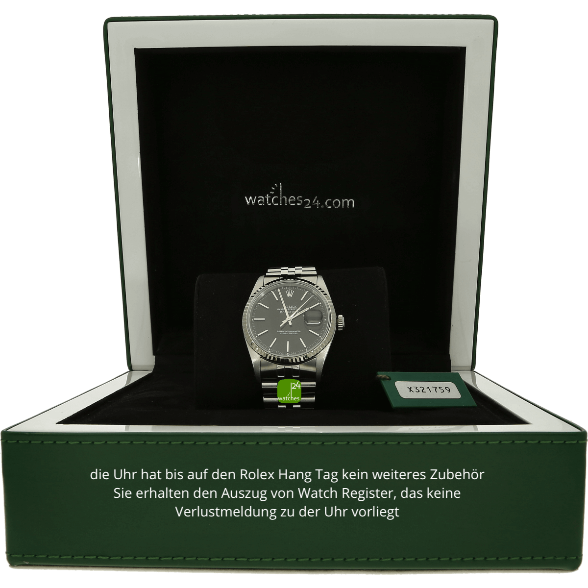 Hat die Uhr keine Original-Papiere, bescheinigen wir die Echtheit in Form eines Zertifikates. Die Referenz-/ Serien-Nummer wird von uns dokumentiert in der personalisierten watches24-Rechnung.