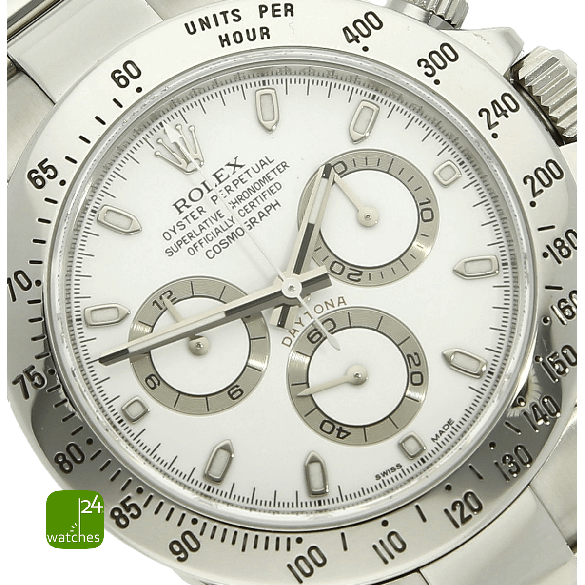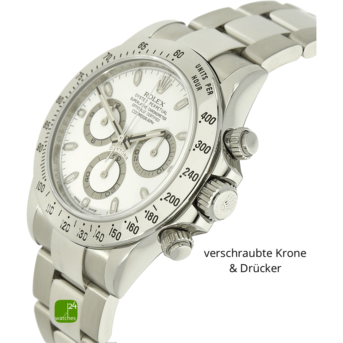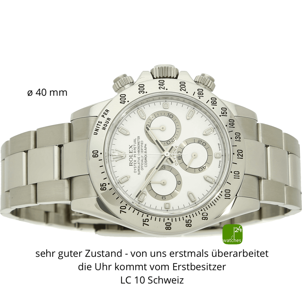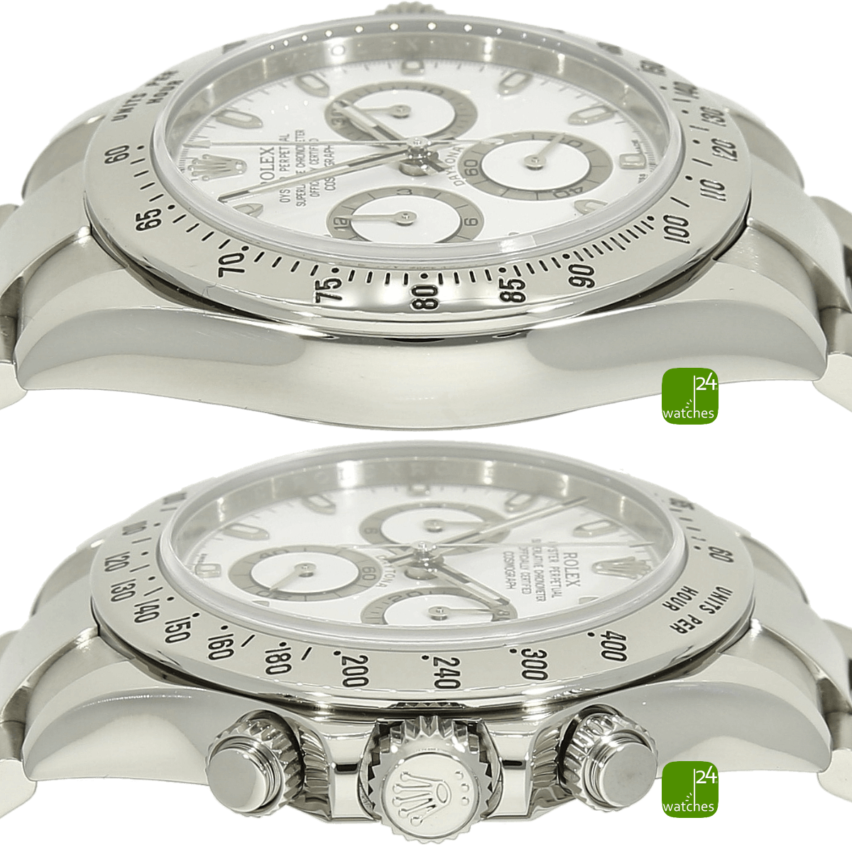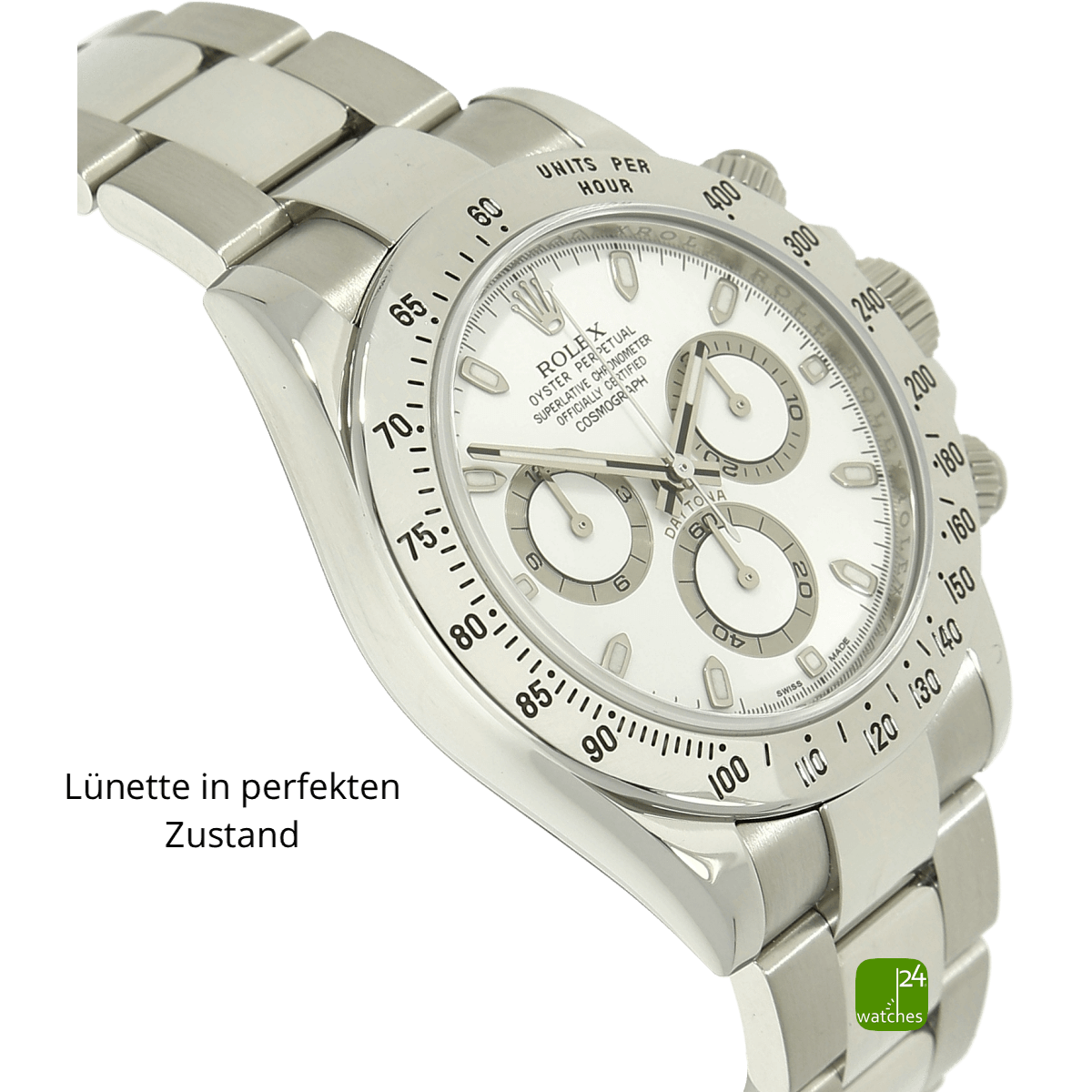 Edelstahl poliert | Gehäusedurchmesser ohne Krone gemessen 40 mm - mit Krone 42,5 mm | von Bandanstoss zu Bandanstoss 46,5 mm | Gehäusehöhe 12 mm | massiver geschraubter Gehäuseboden mit leichten Gebrauchsspuren | Saphirglas entspiegelt und unbeschädigt | orig Rolex Krone & Drücker verschraubt | Edelstahllynette mit Tachymeter Anzeigen graviert | Bandanstoss 20 mm | lt Hersteller 100 m wasserdicht | Gesamtgewicht 142,20 Gramm