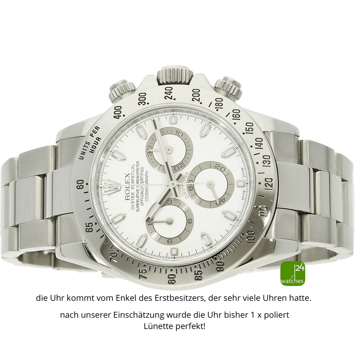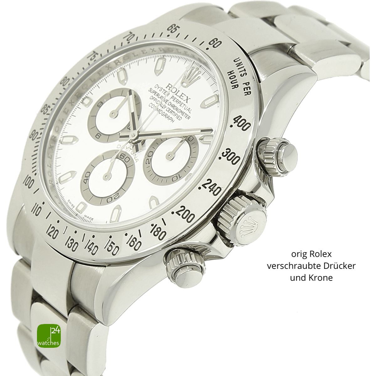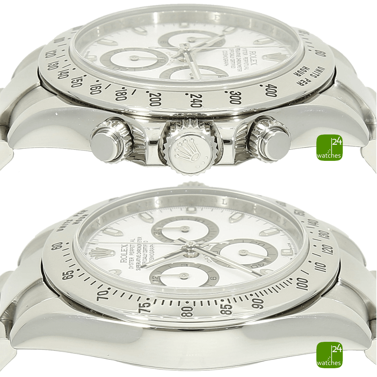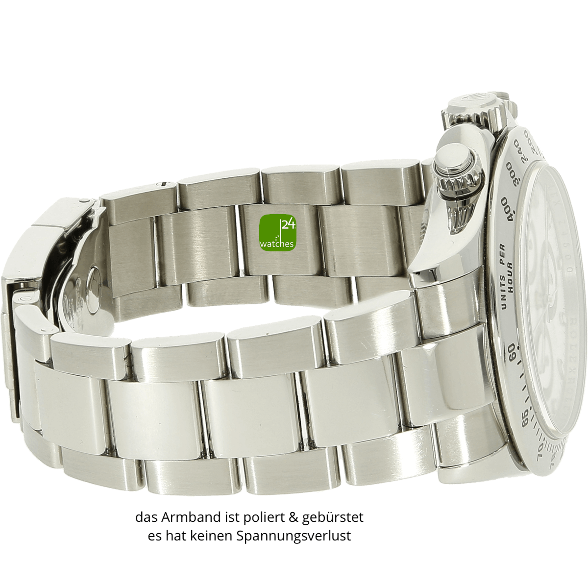 Edelstahl poliert | Gehäusedurchmesser ohne Krone gemessen 40 mm - mit Krone 42,5 mm | von Bandanstoss zu Bandanstoss 46,5 mm | Gehäusehöhe 12 mm | massiver geschraubter Gehäuseboden mit leichten Gebrauchsspuren | Saphirglas entspiegelt und unbeschädigt | orig Rolex Krone & Drücker verschraubt | Edelstahllynette mit Tachymeter Anzeigen graviert perfekt | Bandanstoss 20 mm | lt Hersteller 100 m wasserdicht | Gesamtgewicht 142,20 Gramm