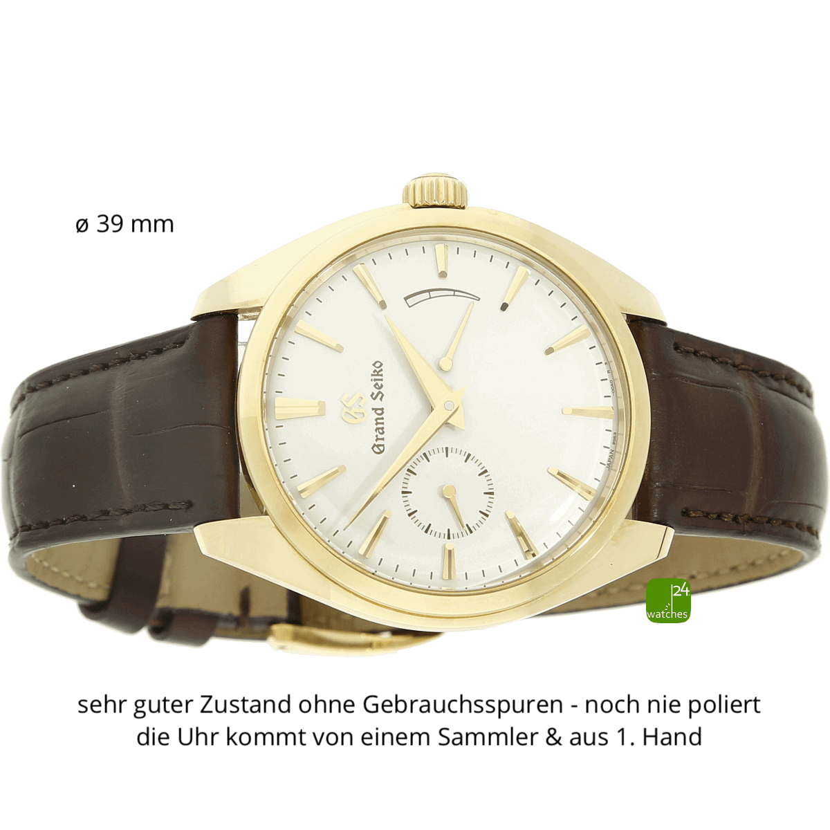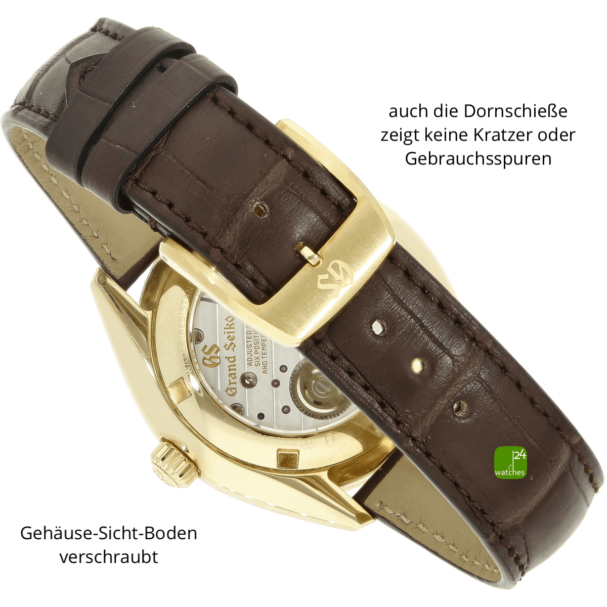 orig Seiko Alligator Leder Armband ungetragen mit leichter Druckstelle vom Aufspannen auf das Kissen | orig Grand Seiko Dornschließe in 18 ct / 0,750 Gelbgold | die Uhr kommt zusätzliche an einem sehr hochwertigen Alligator Leder Armband in braun - an dem die Uhr auch fotografiert wurde.