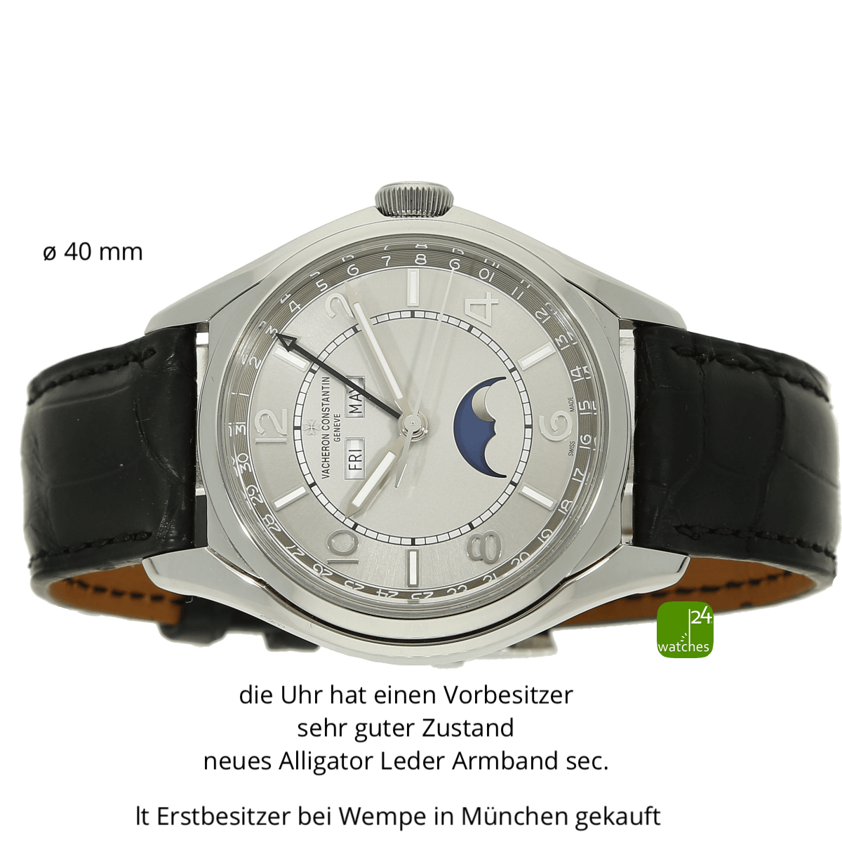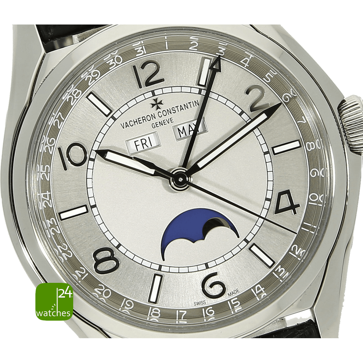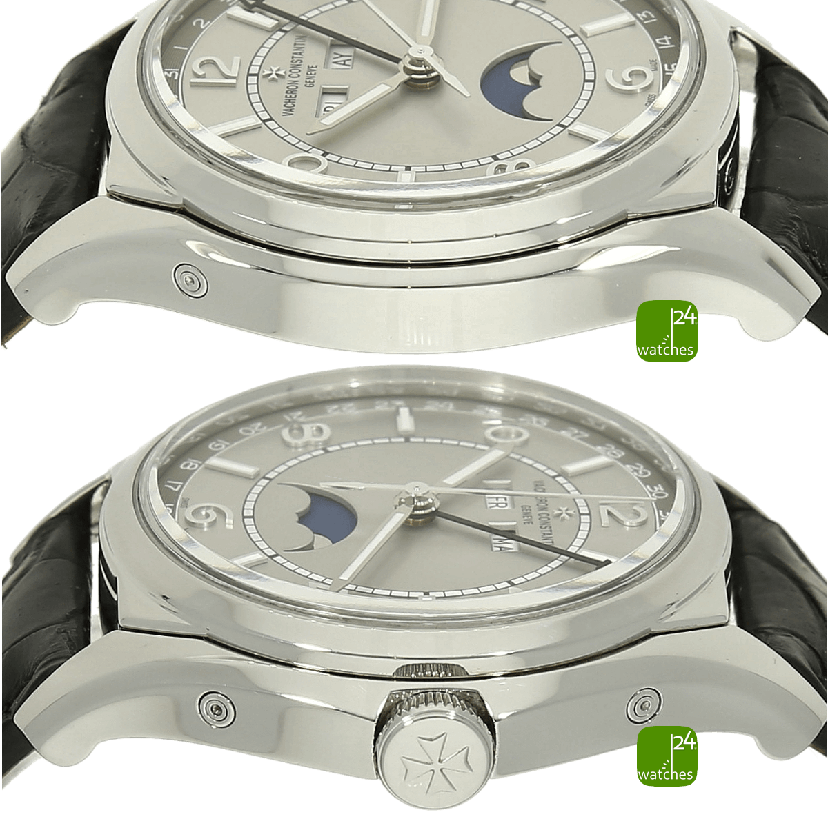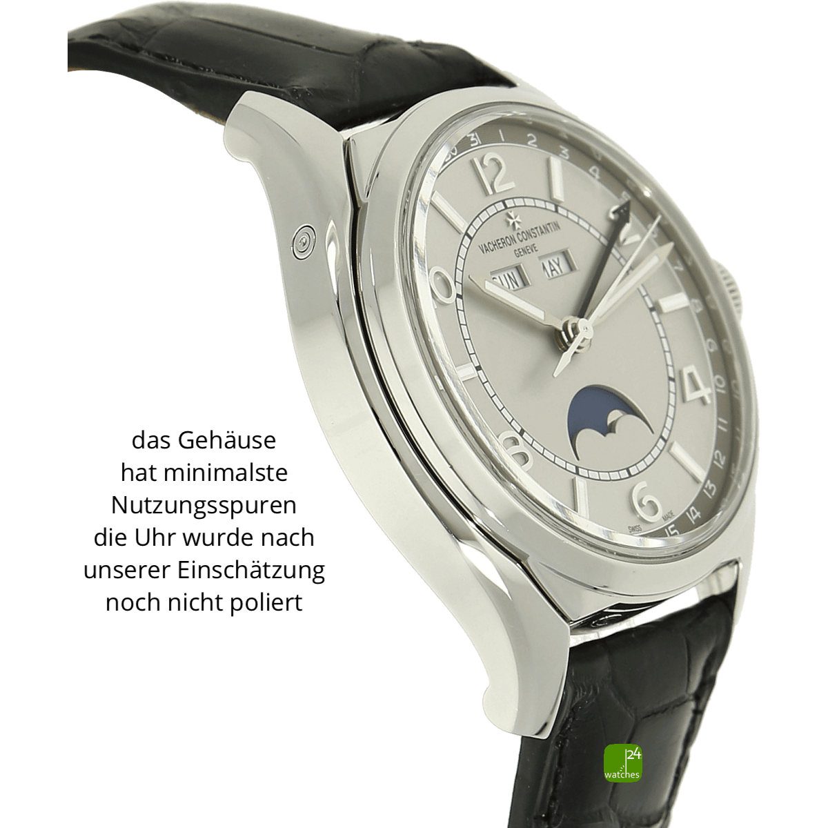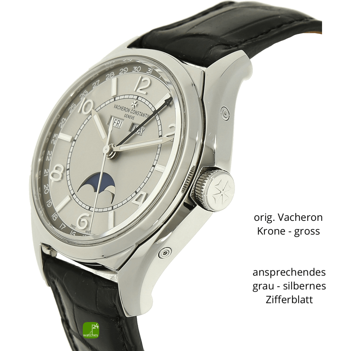 Automatik | VC Cal. 2460 QCL/1 |28.800 A/h | 40 Stunden Gangreserve | 27 Steine | 308 Teile| Anzeige von Stunden, Minuten, zentralen Sekunden | digitaler Wochentag bei 11 Uhr | digitales Monat bei 1 Uhr | Mondphasenanzeige bei 6 Uhr | zentrales Monatsdatum
