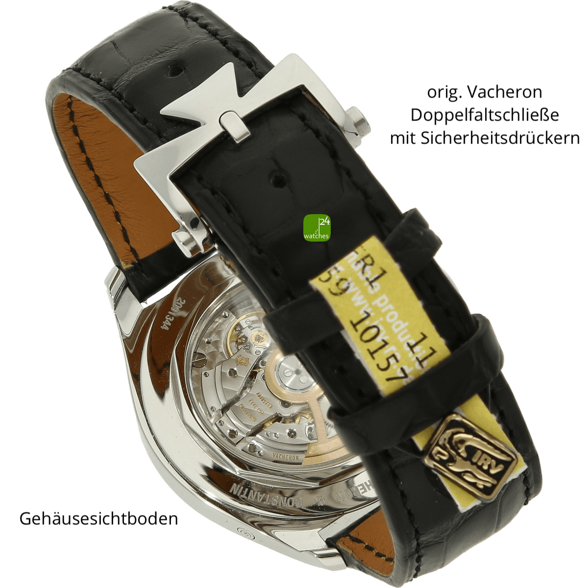 Edelstahl poliert | Gehäusedurchmesser ohne Krone 40 mm - mit Krone 42 mm | von Bandanstoss zu Bandanstoss 48 mm | Gehäusehöhe 11,5 mm | Gehäuse Sicht Boden mit Gravuren | Saphirglas entspiegelt ohne Beschädigung | orig Vacheron Krone mit dem Malthäser Kreuz | lt Hersteller bis 30 m wasserdicht | Bandanstoss 20 mm | Gesamtgewicht 76,35 Gramm